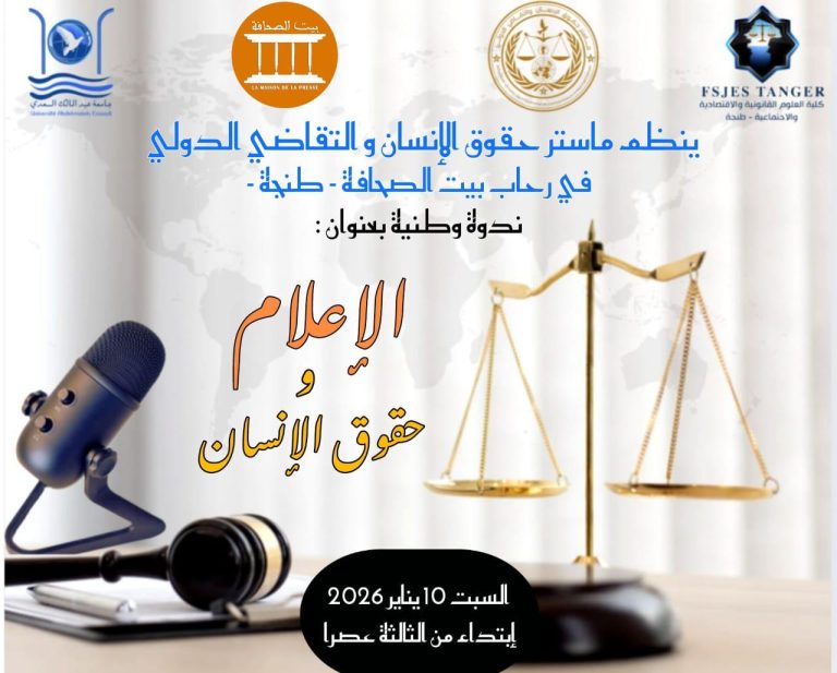ينظم ماستر حقوق الإنسان والتقاضي الدولي بكلية العلوم القانونية والاقتصادية والاجتماعية بطنجة، يوم السبت المقبل، ندوة وطنية تحت عنوان “الإعلام وحقوق الإنسان: تحديات ورهانات”، وذلك بمقر بيت الصحافة بطنجة.