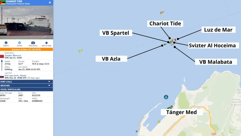 شاركت أمس الجمعة أربع زوارق صيانة مغربية هي VB Spartel، VB Malabata، Svitzer Al Hoceima، وVB Azla في عملية مساعدة ناقلة النفط Chariot Tide التابعة للأسطول الروسي “الفانتوم”، والتي تعرضت لعطل منذ صباح الخميس وأصبحت بلا قدرة على المناورة في المياه المغربية قبالة سواحل طنجة، وفق ما أفادت به تقارير صحيفة Europa Sur.